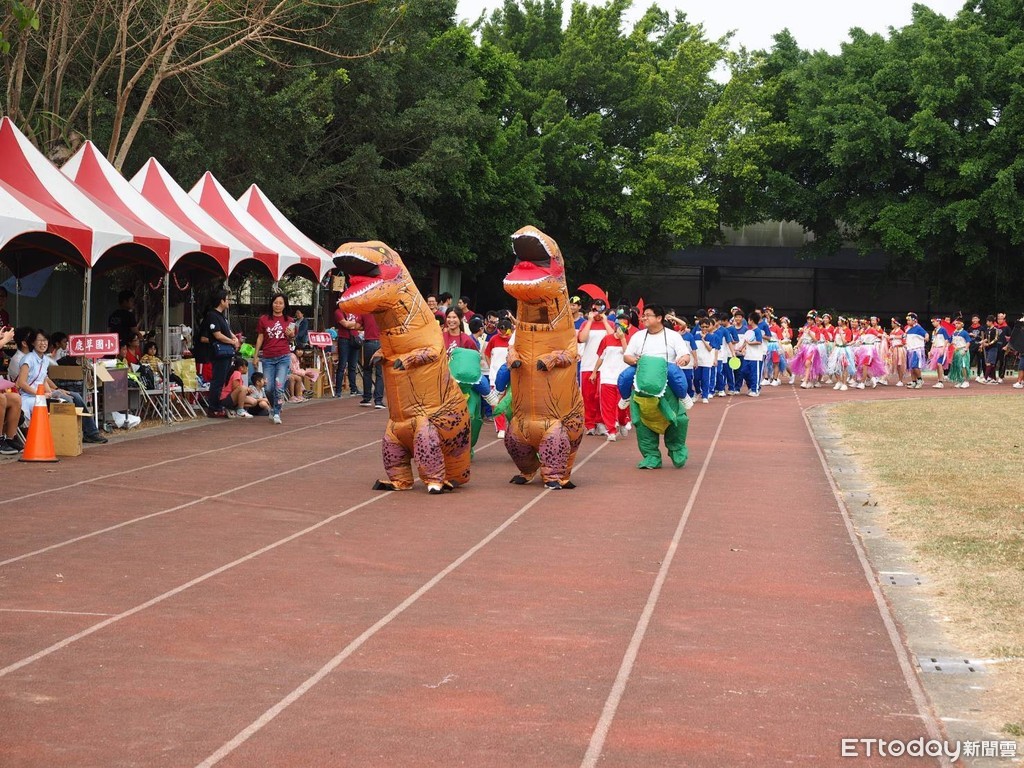 ▲▼ 鹿草國中55年校慶,家長會代表穿恐龍裝出場成為全場亮點。(圖/記者翁伊森翻攝)