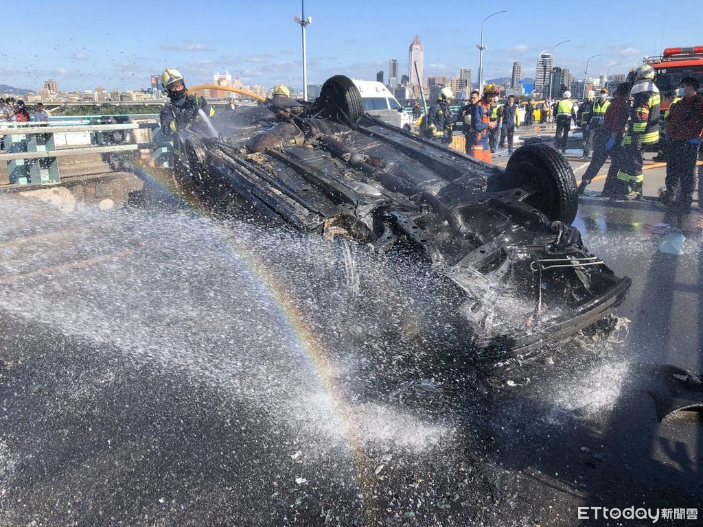 ▲情侶行經中興橋發生碰撞翻覆,導致單親媽媽受困車內燒成焦屍。(圖/記者陳以昇翻攝)