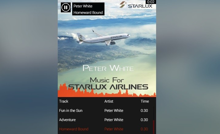 有星宇粉發現爵士樂巨擘Peter White,在數位音樂平台上發行「Music for STARLUX Airlines」專輯,經證實,6首歌曲就是星宇航空登機、降落時的機上音樂,但屆時在機上播放時,樂聲會稍有不同。其中,Flying High、Fun in the Sun、Island Getaway是登機音樂,Landing music:Peaceful、Adventure、Homeward Bound則是降落時的歌曲,6首歌曲皆可搶先聽30秒。