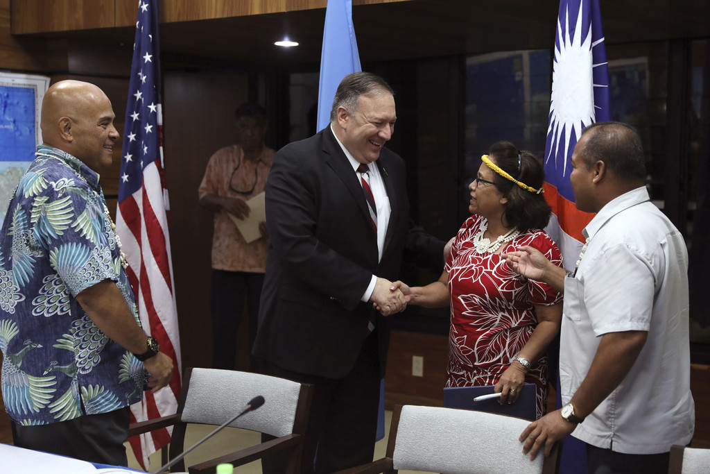 ▲ 美國國務卿龐培歐今年8月與馬紹爾群島總統海妮(Hilda Heine,右二)握手。(圖/達志影像/美聯社)