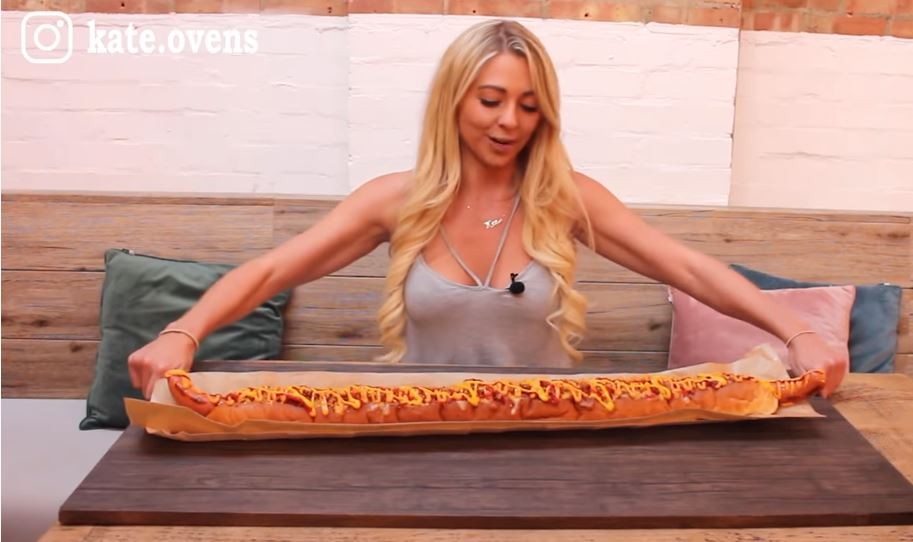 英國25歲的正妹大胃王凱特(Kate Ovens)日前到一間熱狗店,挑戰吃下一條3英尺(約0.9公尺),由豬肉、牛肉和培根臘腸特製的巨大熱狗堡,售價為45英鎊(約1816元台幣),熱量高達5000卡路里,但她僅僅花了25分鐘就全數完食,讓餐廳廚師跟觀看的人嘖嘖稱奇。
