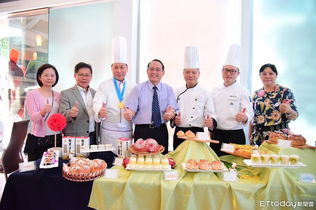 ▲▼戴昌賢校長(左四)與創意料理人員、餐旅系趙偉廷老師以火龍果皮製作美式火龍果漢堡。