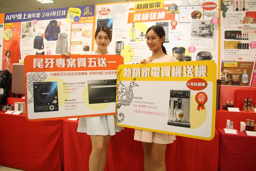 因應尾牙檔期提前與天氣變冷,暖意小家電市場需求增加,新光三越站前店特別對家電推出多達10款小家電滿一送一方案,如購買飛利浦雙向脈衝智慧萬用鍋,加上HI電子鍋,原價46,800元,特價19,490元,再加送黑金爐;Nespresso Essenza mini膠囊咖啡機,原價7,180元,特價4,490元,再加送Aero3 奶泡機。
