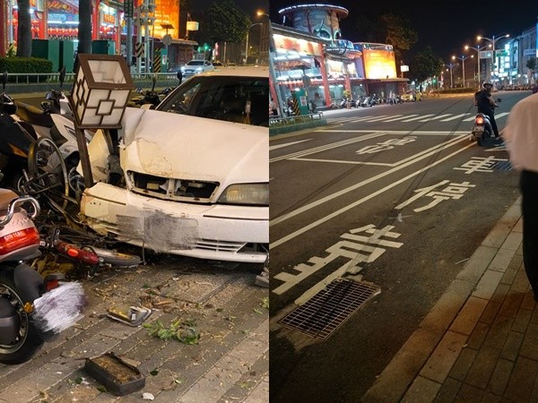 有網友在臉書社團「屏東人屏東事」PO出現場照片,可以看見剎車痕一路延伸至斜前方車道,可見當時車速之快;另外,白車撞上路旁的小路燈後,右前方的車頭燈、引擎凹陷。
