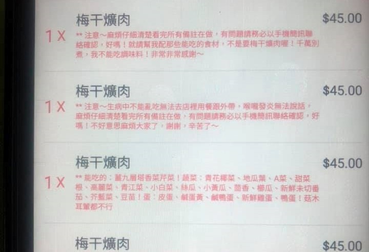 「看到這位人客這麼用心地打完備註,看來你只能喝水囉!」一名餐飲業者今(19日)在臉書「爆廢公社」中貼出一張外送訂單,只見客人點了4份梅干爌肉,每一項下方都各寫了一大段紅色備註。然而眼尖網友一看到這語氣,懷疑就是上回「煎蛋不要煎」、「蘿蔔湯不要湯」的驚世奧客。
