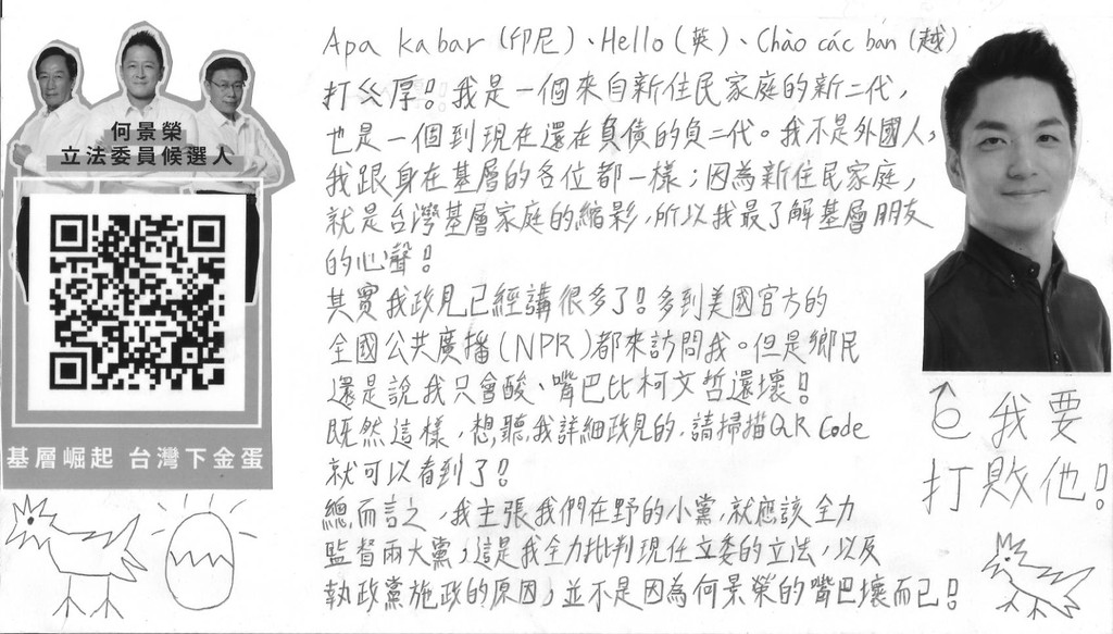 何景榮在交給選委會的政見欄上放上蔣萬安的照片,並在照片下面畫了一隻「印尼雞」,還寫下「我要打敗他!」箭頭就是指向蔣萬安的照片。