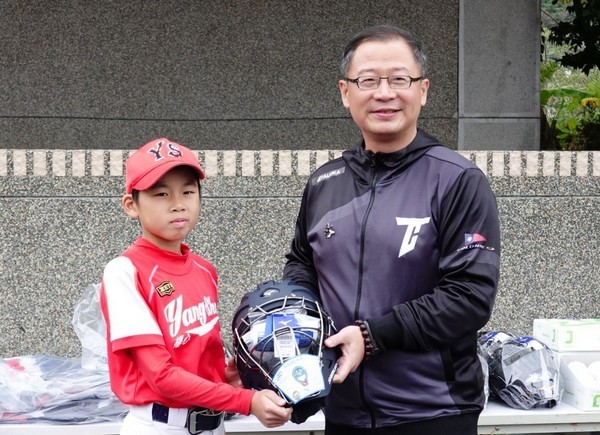 ▲▼中華職棒大聯盟會長吳志揚(右)和楊心國小小球員互動並進行捐贈。(圖/練達提供)