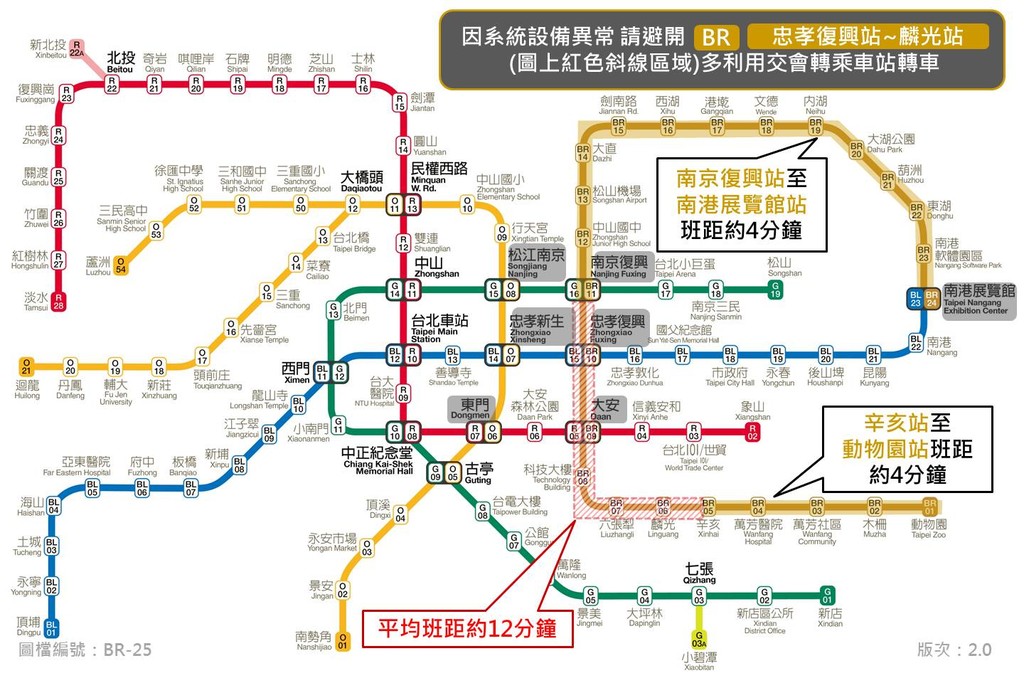 「台北捷運」臉書粉專約在晚間18時緊急通知,文湖線發生異常,請乘客盡量避開文湖線忠孝復興站至麟光站(忠孝復興、大安、科技大樓、六張犁),此段平均班距延長至約12分鐘,而文湖線辛亥站至動物園站班距約4分鐘,南京復興站到南港展覽館站的班距時間也約4分鐘。