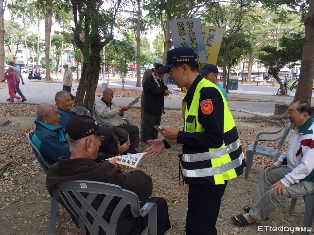 ▲台南市警交通警察大隊,為宣導行人正確交通觀念,特派員前往台南市南區夏林路水萍塭公園,針對年長者易據集地點,進行交通安全宣導。(圖/記者林悅翻攝,下同)