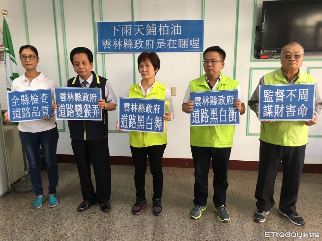 ▲民進黨雲林縣黨部主委廖丁賜(左二)、民進黨議會黨團總召黃淑鈴(左三)、雲林議員蔡岳儒(右二)要求縣府調查雨天鋪設柏油,影響工程品質是否有疏失與全縣檢查道路品質。(圖/記者蔡佩旻翻攝)