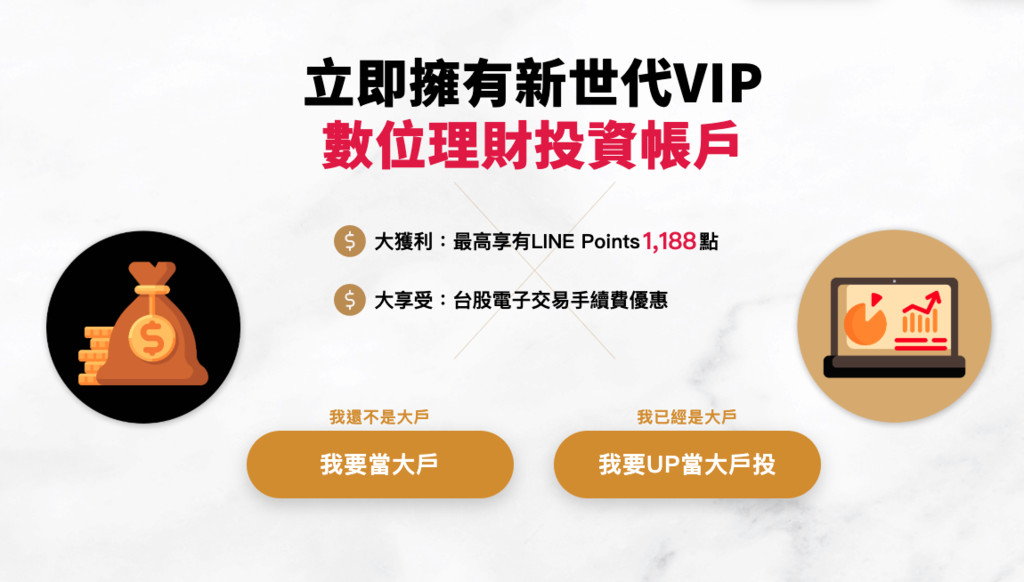 即日起,永豐銀行大戶DAWHO立即升級為「大戶投」,客戶於永豐金證券網站線上開立證券帳戶,即可立即擁有「新世代VIP數位理財投資帳戶」,全程線上作業並首創「最快1小時可下單」,大幅提升線上服務的便利性及時效性。完成升級體驗最高可享活期存款1.1%高利、LINE Points 1,188點、證券交易100萬內再享超低手續費等優惠。