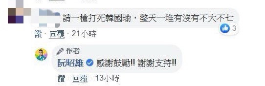 該篇貼文下方,有網友留言,「請一槍打死韓國瑜,整天一堆有沒有不大不七(台語俗諺,意旨不三不四)。」阮昭雄小編回文,「感謝鼓勵!!謝謝支持!!」