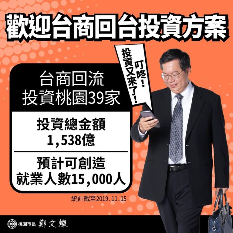 鄭文燦透過臉書表示,桃園的投資成績顯著,占目前全國台商回流總投資金額四分之一,設廠及擴廠以高階製造、研發中心為主,能夠幫助台灣產業振興、帶動升級。