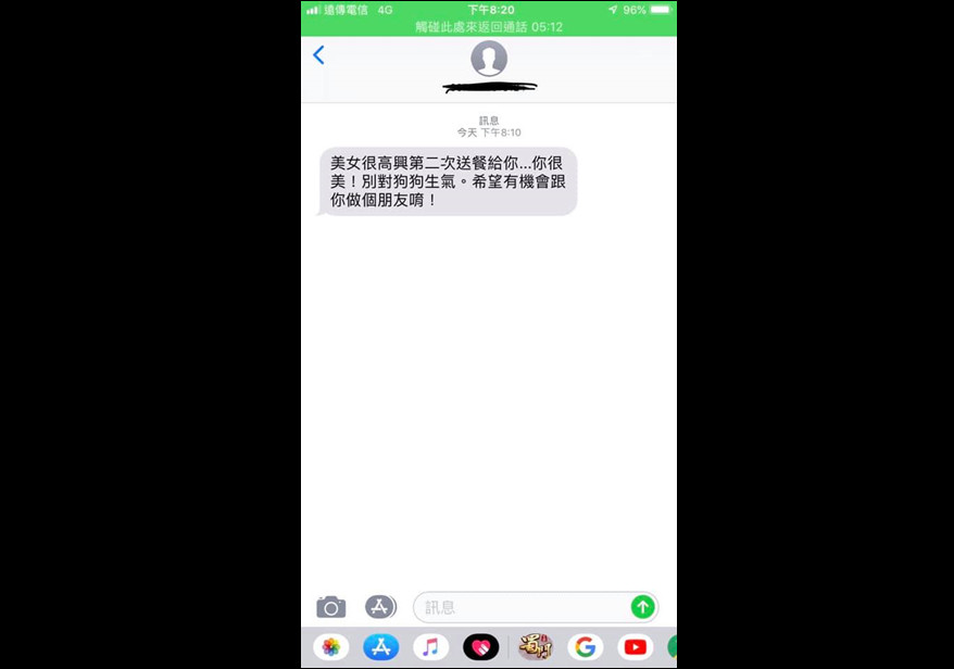 原PO在臉書社團《爆怨公社》貼出一段簡訊截圖寫道,「現在的熊貓外送都這樣嗎?」而仔細一看簡訊內容,外送員在送完餐點後,竟傳訊,「美女很高興第二次送餐給你...你很美!別對狗狗生氣。希望有機會跟你做個朋友唷!」讓原PO看了冷汗直冒,「感覺好恐怖,都外送有地址了,這樣誰敢叫熊貓啊!」