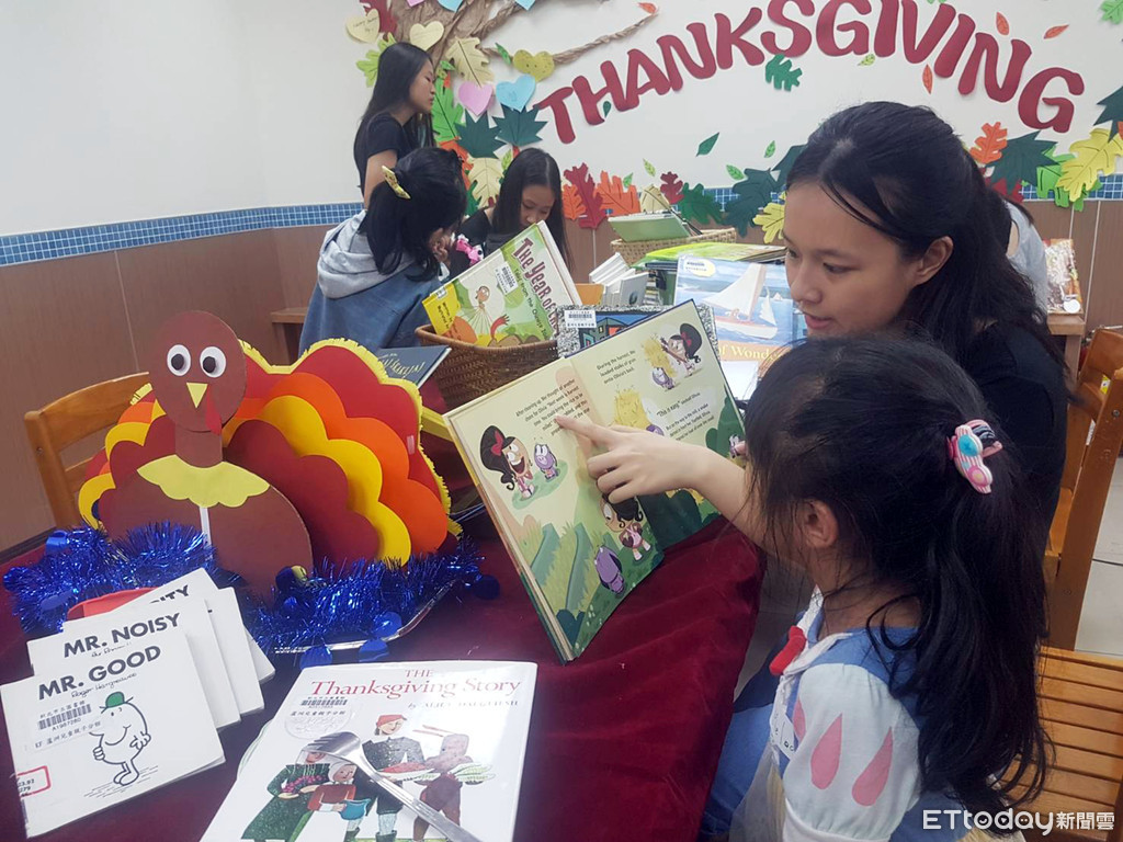圖書館因此特別在感恩節與國際志工日前夕,布置了感恩節閱讀餐桌,讓小朋友可以體驗與眾不同的感恩大餐,同時感謝這群外籍學子義務到圖書館陪伴孩子閱讀、教英文,增進小朋友的語文能力。