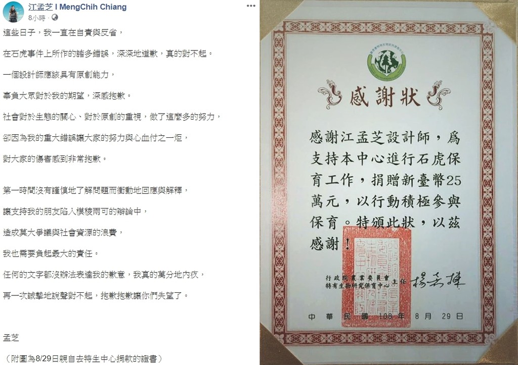 江孟芝在貼文中提到,石虎事件爆發至今已3個月,這段時間裡她不斷地反省與自責,不但作品是從圖庫購買的,事後也沒注意到石虎像欠缺「眼窩內側有兩條延伸到額頭白線」的重要特徵,引來外界強烈抨擊,甚至質疑她,「這直接抄有點扯…原來設計師這麼好當。」