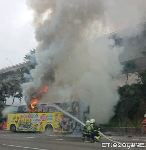 ▲桃園客運在國道燒車,警消全灌救。(圖/擷自爆料公社)