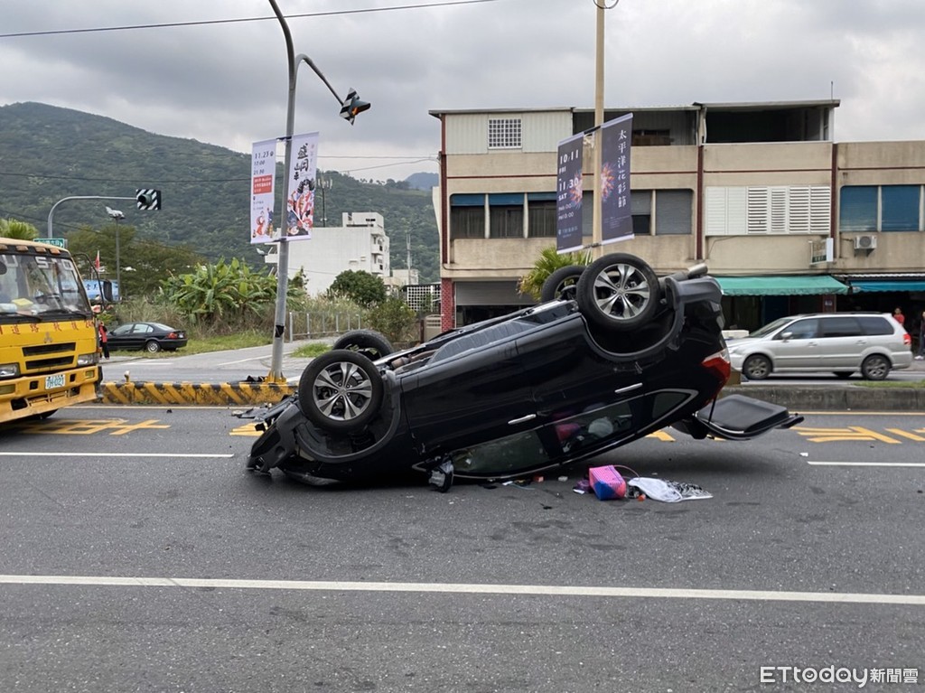 ▲▼黑色自小客車自撞分隔島後,車翻成四腳朝天,所幸女性駕駛意識尚清楚。(圖/記者王兆麟翻攝,下同)