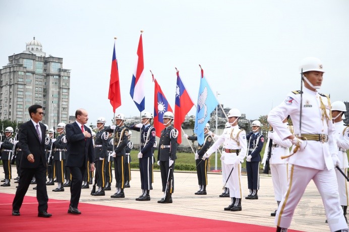 上午的贈勳儀式,在國防部博愛營區舉行,嚴部長首先以隆重軍禮歡迎索多部長到訪;隨後,嚴部長代表政府頒授「二等寶鼎勳章」,包括巴拉圭駐華大使柏馬紹等官員均到場觀禮,場面隆重。