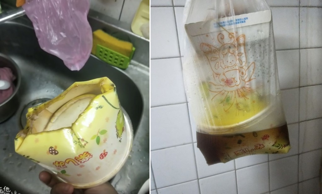 ▲外帶紙碗不耐熱,底部容易脫落。(圖/翻攝自爆廢公社二館)