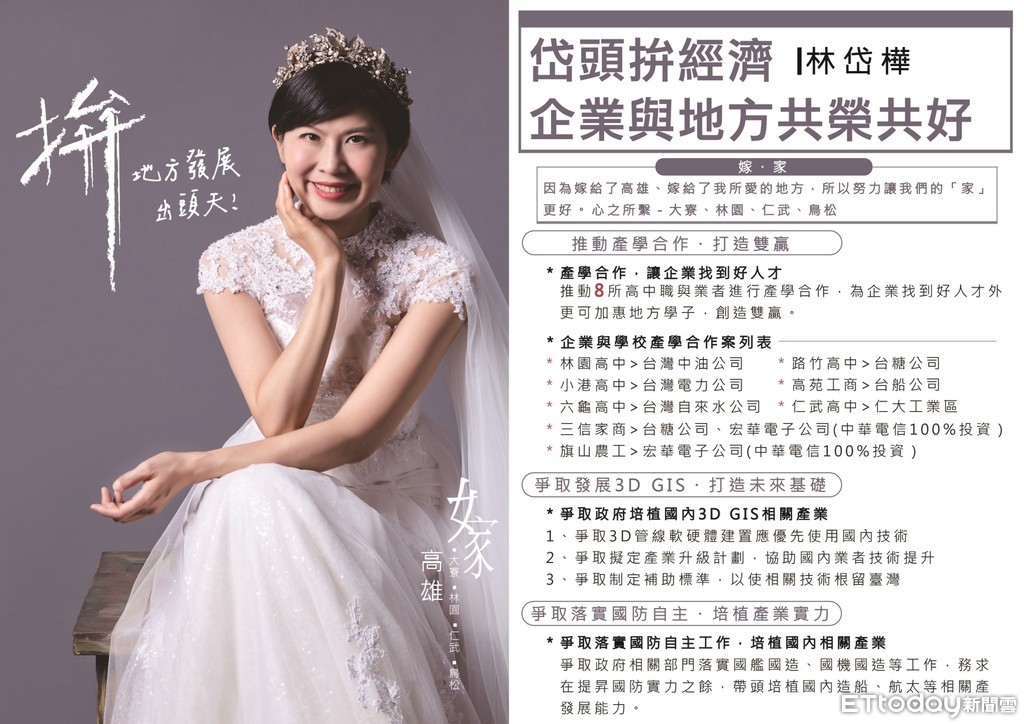 不過主題訂為「嫁給高雄」林岱樺也不是第一人,去年曾參加旗津、鼓山、鹽埕選區選舉的市議員候選人蔡宜芳,穿起白紗露出「低胸深V 」,喊著要「嫁給高雄」,成功吸睛引爆話題。