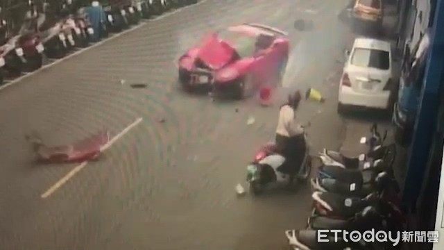 新北市新莊區福營路26日下午發生一起車禍意外,當時一輛紅色法拉利逆向衝撞,導致2名騎士被撞飛,其中一名女子當場命危,經送醫搶救後仍是不幸宣告不治,而稍早撞擊的監視器畫面也隨之曝光,畫面相當驚悚。