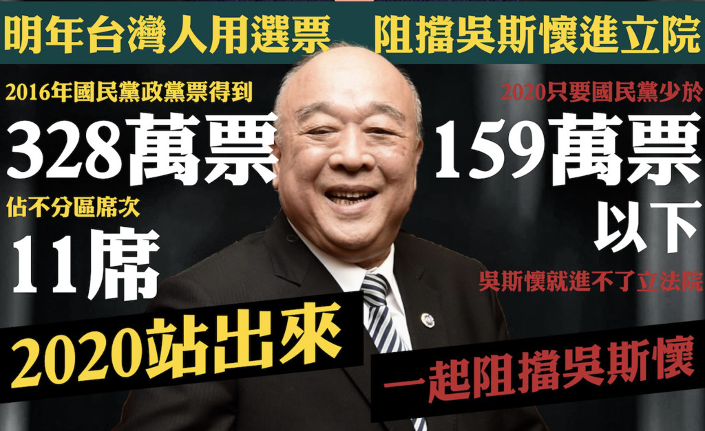 2016年國民黨拿到328萬的政黨票,取得11個不分區立委席位,由此推算,吳斯懷位列不分區名單的第四名,唯有國民黨的政黨票少於159萬票,才能成功阻止吳斯懷進立院。綠黨呼籲選民,「我們可不可能、可不可以團結一次,讓國民黨少於159萬票」。