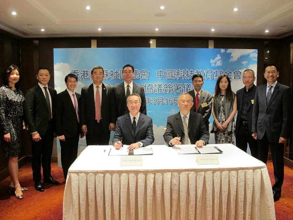 ▲陳永光(右一)和太太陳若華都是政大傑出校友。圖為去年3月,香港江蘇社團總會唐英年(前左)與中國科技教育基金會理事長向心(前右)在香港洲際酒店簽署合作框架協議時留影。(圖/鏡週刊提供,下同)