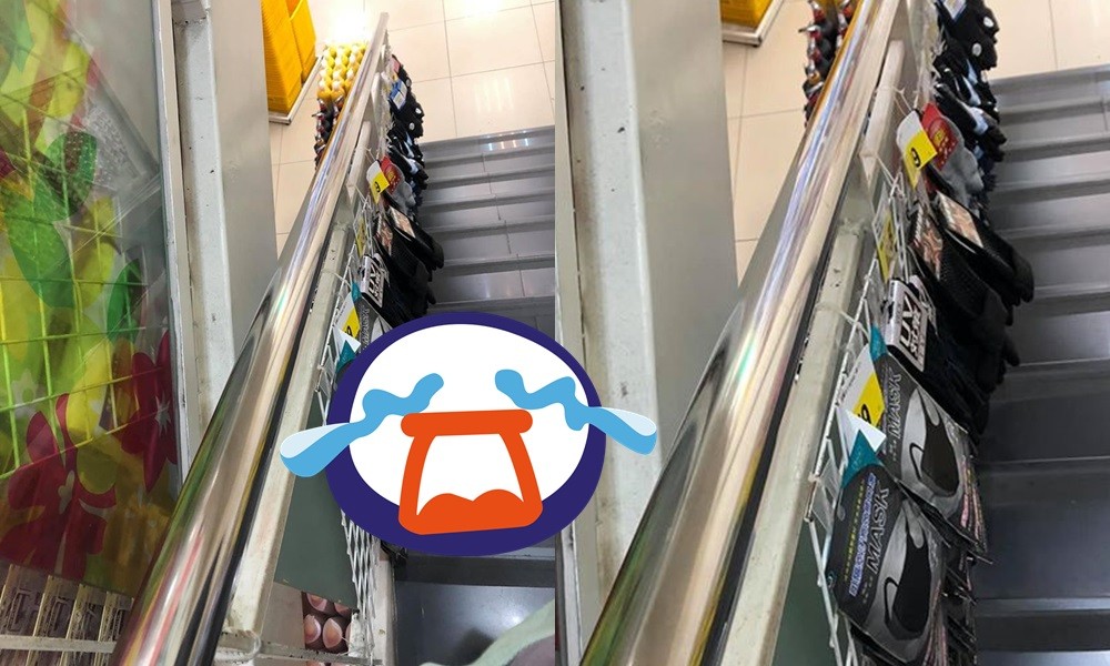 這位女網友在臉書《爆廢公社》貼出一張照片,文中僅簡單一句「這個扶手,是很多人冬天的噩夢」,仔細看看照片,只見原PO正要下樓梯,但下一秒她卻拿出手機拍下賣場金屬扶手的照片,樓梯一旁還掛著格子狀的欄杆,上面則掛有口罩、襪子等商品。