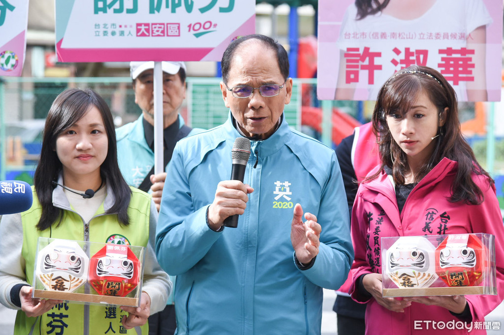 ▲前行政院長游錫堃陪同大安區立委候選人謝佩芬於白蘭市場拜票。(圖/記者林敬旻攝)