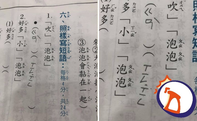 原PO表示,「叫你給我 『ㄎㄢˋ ㄒㄧㄥㄒㄧㄥ』,你給我 『ㄍㄢˋㄒㄧㄥㄒㄧㄥ』是.......在幹什麼東西?」從畫面中可見,習題的第六大題,是不少人在小學時期曾經寫過的照樣寫短語,而這次習題本上要小朋友以「吹泡泡」為題,去改寫造句,但這名小朋友本來想要寫出「ㄎㄢˋ ㄒㄧㄥㄒㄧㄥ」,卻不小心寫成「ㄍㄢˋ ㄒㄧㄥㄒㄧㄥ」啦!