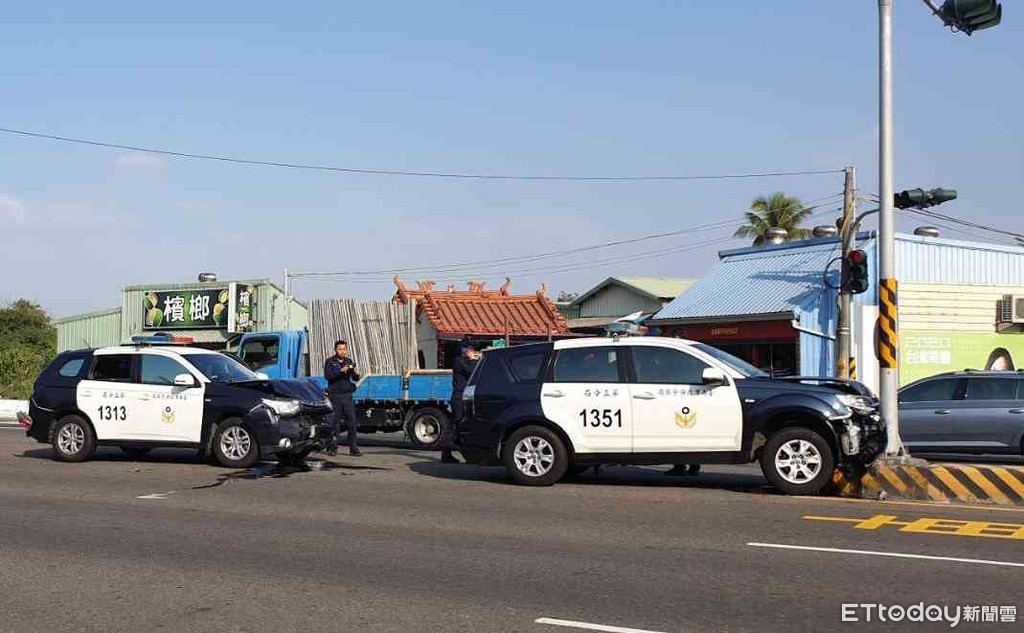▲台南市警三分局2車支援六分局特勤勤務,在濱南路與喜樹路222巷口停等準備左轉時,遭何姓男子駕駛的大貨車自後追撞,造成2警車毀損,5名員警受傷送醫。(圖/記者林悅翻攝,下同)