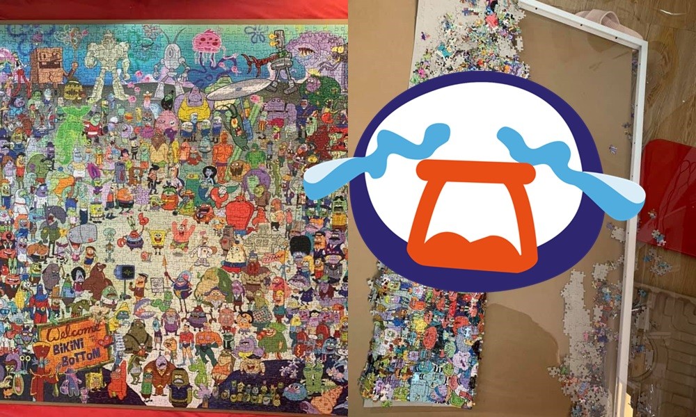 仔細看看拼圖,只見原PO拼的是知名卡通的圖案,3千片拼圖拼成的圖案上,畫滿密密麻麻的各種角色,從主角到可能只出現過1幕的小角色都被畫入。但原PO一個手滑,整片拼圖就直接對折一半,一部分也當場散開,彷彿天女散花的一幕,讓人直接心冷一半。