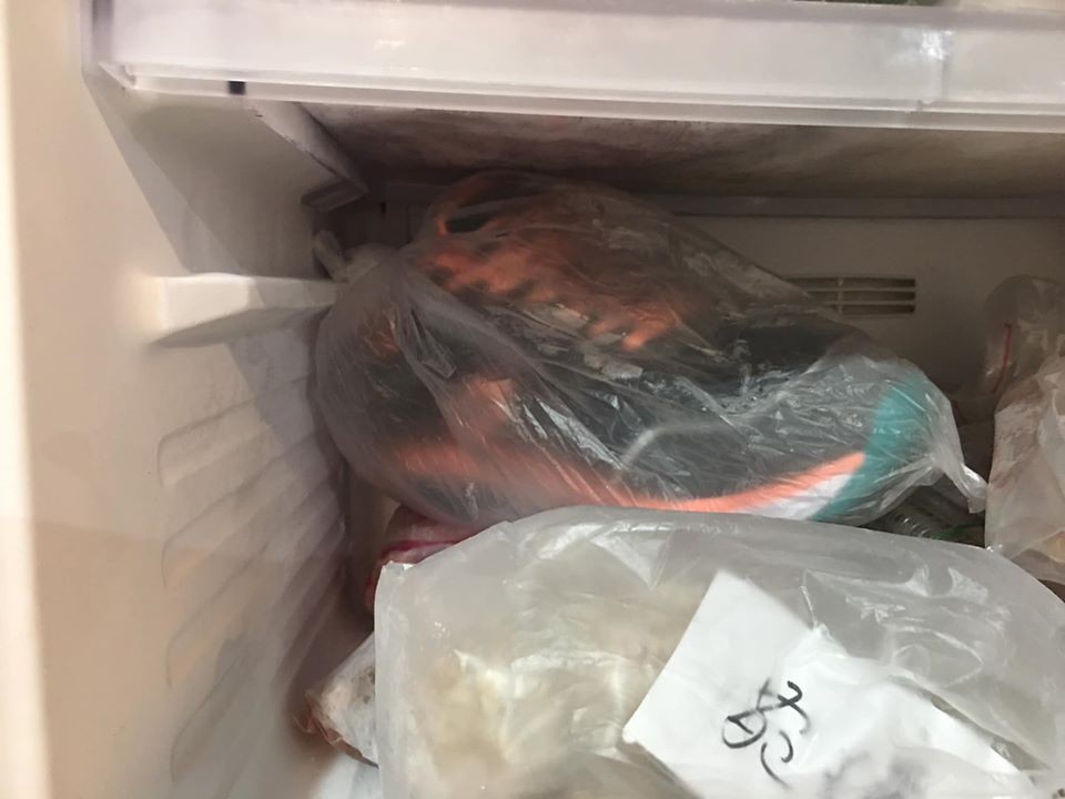 女網友昨晚在冷凍庫裡,驚見一隻球鞋被包進透明塑膠袋中,同時壓在一袋袋食物之上,傻眼又好奇的她,忍不住拍下畫面,並在「爆廢公社二館」po文直呼,「求解~媽媽為什麼要這樣做?」