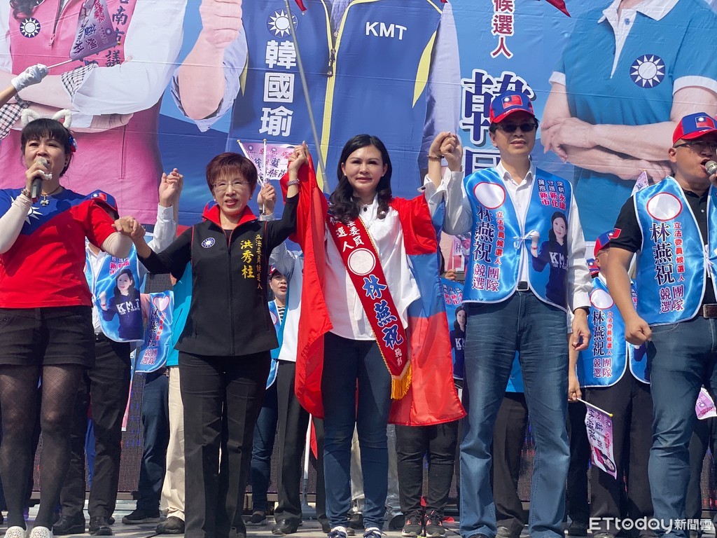 ▲台南市第四選區立法委員參選人林燕祝,舉辦新化區聯合競選總部成立大會,張善政副總統參選人,為林燕祝披上國旗披風,洪秀柱等人到場站台力挺。(圖/記者林悅翻攝,下同)
