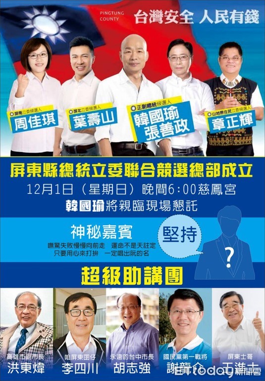 韓國瑜屏東縣競選總部總幹事廖婉汝表示,今天的總部聯合成立大會,將從下午18時起開場,除韓國瑜外,有多位名嘴會來助講,包括謝龍介、前台中市長胡志強、周錫瑋、李四川等。