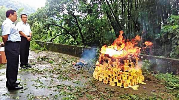 ▲警方回現場祭拜亡靈,焚燒紙錢時,火焰中竟出現人臉(紅圈處)。(翻攝畫面)