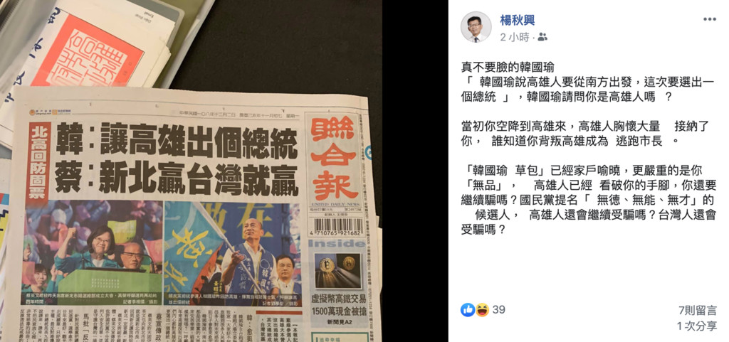 2020總統大選國民黨候選人韓國瑜在12月份的第一天選擇回到高雄,而且行程滿檔一整天就幫8個同黨立委候選人站台,同時間也尋求高雄市民支持,韓國瑜拋出「讓高雄出個總統」,不過這段話聽在楊秋興耳裡卻不是很舒服,臉書直接開轟韓國瑜:「不要臉」。