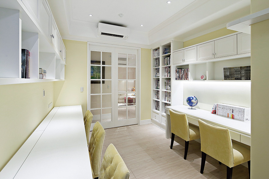 為了喜歡閱讀的女兒,在書房及女兒臥室裡,都做足了書籍的收納空間,書房的書櫃可依需求改變層板高低位置,便於擺放各式書籍;女兒房則是先丈量書籍的尺寸,再配合電視尺寸量身訂製出結合電視櫃的書櫃,滿足各式各樣的書籍收納需求。女兒房的更衣室裡,利用系統家具,在上下壁面空間打造可讓女兒收納包包的收納格;除了床板下方的收納抽屜,也在書桌旁設計了臥榻,利用系統家具規劃,增添收納容量,也讓空間更顯俐落的整體感。