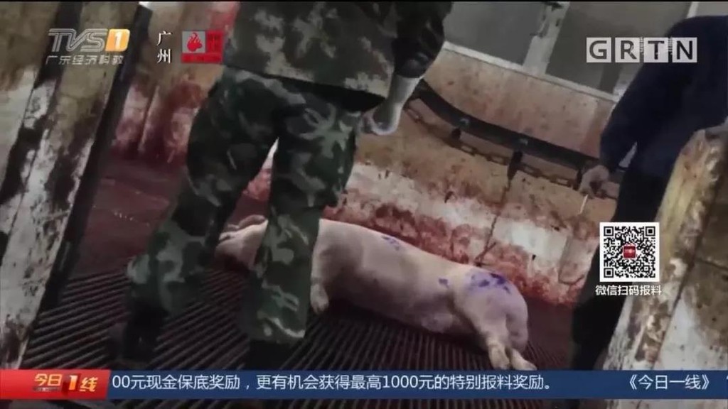 根據《廣東電視台》「今日一線」節目11月30日報導,經過1個月的暗訪發現,原本應該在屠宰場進行無害化處理的病死豬,卻從屠宰場理流出,進入廣東佛山叫南海合誼肉聯有限公司的正規肉聯廠,經過燙洗、脫毛、除內臟等程序後,死豬立馬變身為白條豬。