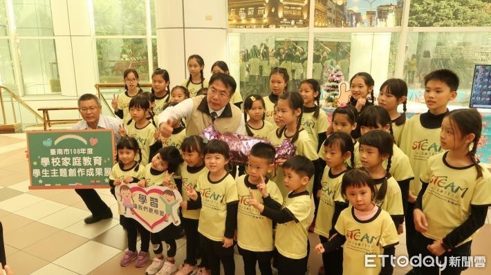 「深耕學校家庭教育學生主題創作」徵選活動已邁入第6年,創作主題以家庭教育內涵為主軸,評審從1409件作品中評選出33件優秀作品,於永華及民治市政中心展出,12月3日開展首日,特別邀請獲獎的學生到場分享創作心得,市長黃偉哲也到場欣賞得獎作品,並致贈聖誕小禮物給現場表演的新南國小小朋友。