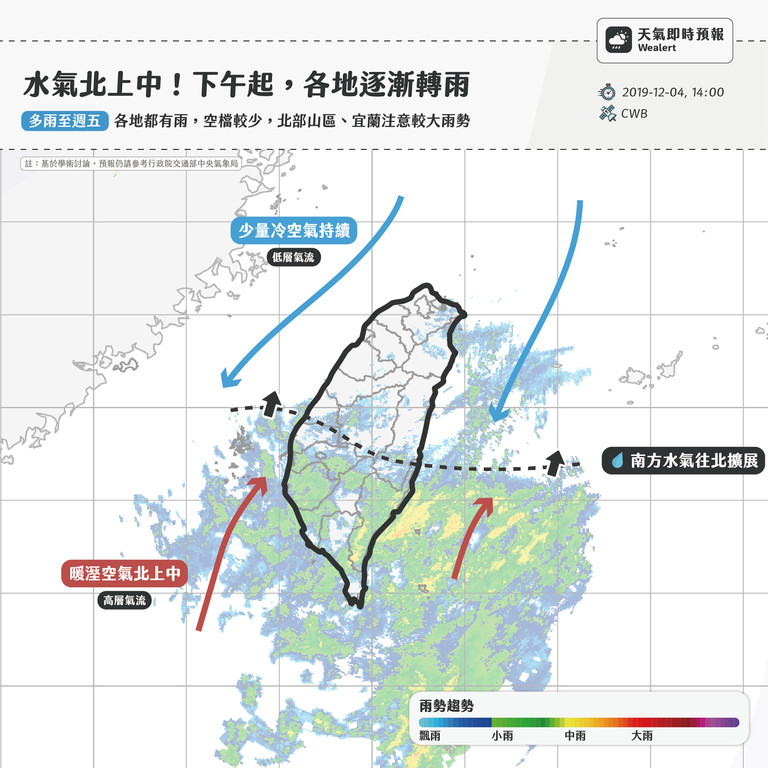 隨著水氣往北移動,南部、東部已開始下雨,中部、澎湖傍晚前會開始下雨,北部、金馬則是傍晚後到晚上間,會轉為大範圍降雨,且越晚雨越大。