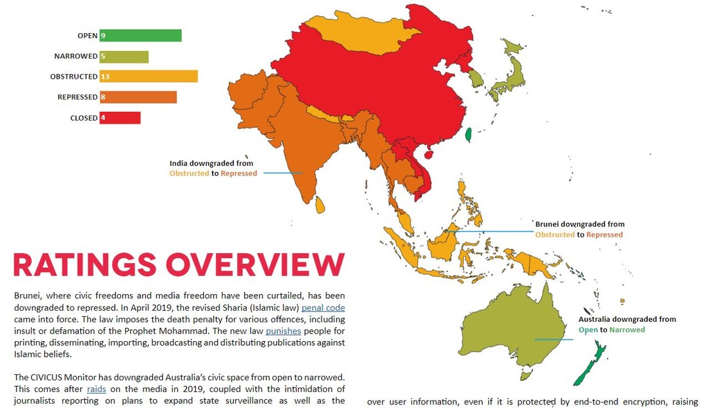 這份報告基於CIVICUS Monitor的數據,對196個國家進行相關評估。來到亞洲地區,打壓公民社會與基本自由的狀況持續存在,25個國家中有4個被評為封閉(closed),8個被評為壓抑(repressed),10個則被列為受限(obstructed),其中台灣是唯一被評為開放的國家。