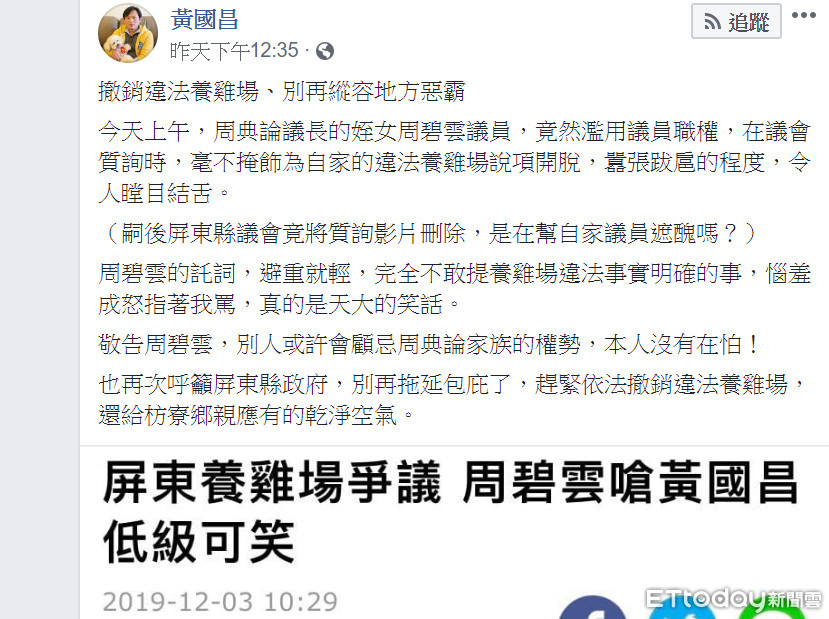 屏東縣議會新聞稿說,12月3日上午,周碧雲議員在縣政總質詢時,質詢有關養雞場一事。詎料會後,黃國昌卻在臉書上寫「周典論議長姪女周碧雲議員,竟然濫用議員職權,在議會質詢時,毫不掩飾為自家的違法養雞場說項開脫…嗣後屏東縣議會竟將質詢影片刪除,是在幫自家議員遮醜嗎?」。黃國昌這段文字完全悖離事實,惡意誣指行為居心叵測。