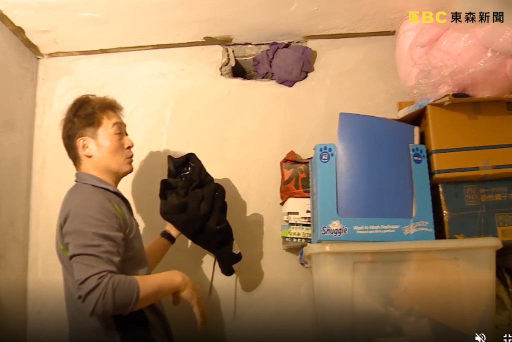 方男向《東森新聞》描述,整間房子幾乎沒有一處整修完成,連工業風清水模都用仿的,線沒有對齊,還有個大破洞也沒有補,就這樣丟著,「平常為了遮醜就這樣子,門框門板都會割人,這個都是割到的傷痕…」這間屋子方家一家四口已經住了2年。