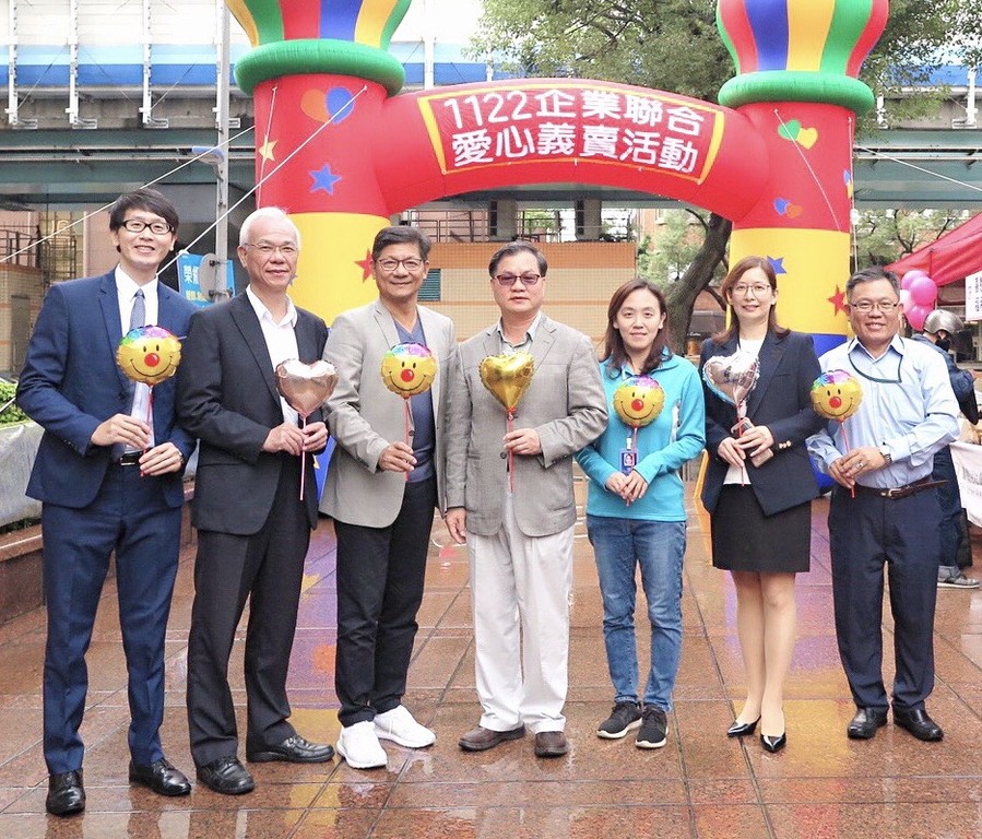 ▲集保結算所邀集鄰近公司行號共同參與慈善義賣活動,朱漢強總經理(中)與各家企業代表合影。