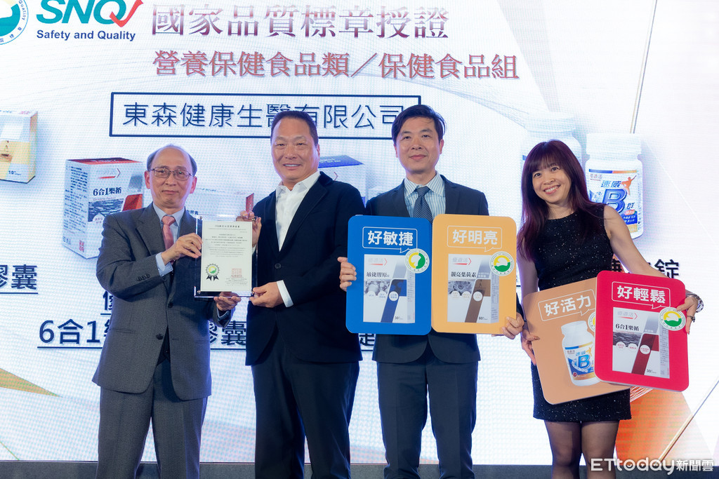 今年通過「SNQ國家品質標章」認證生醫產品名單出爐,多達近百項生醫產品獲標章之外,另有8項得到國家生技醫療品質獎,其中,東森健康生醫今年首次參加就有4項營養保健食品取得認證,東森集團總裁王令麟親臨頒獎典禮接受表揚授證,他也提到,國家重視產品品質、消費者重視健康的方向,一直是東森持續不變的目標。