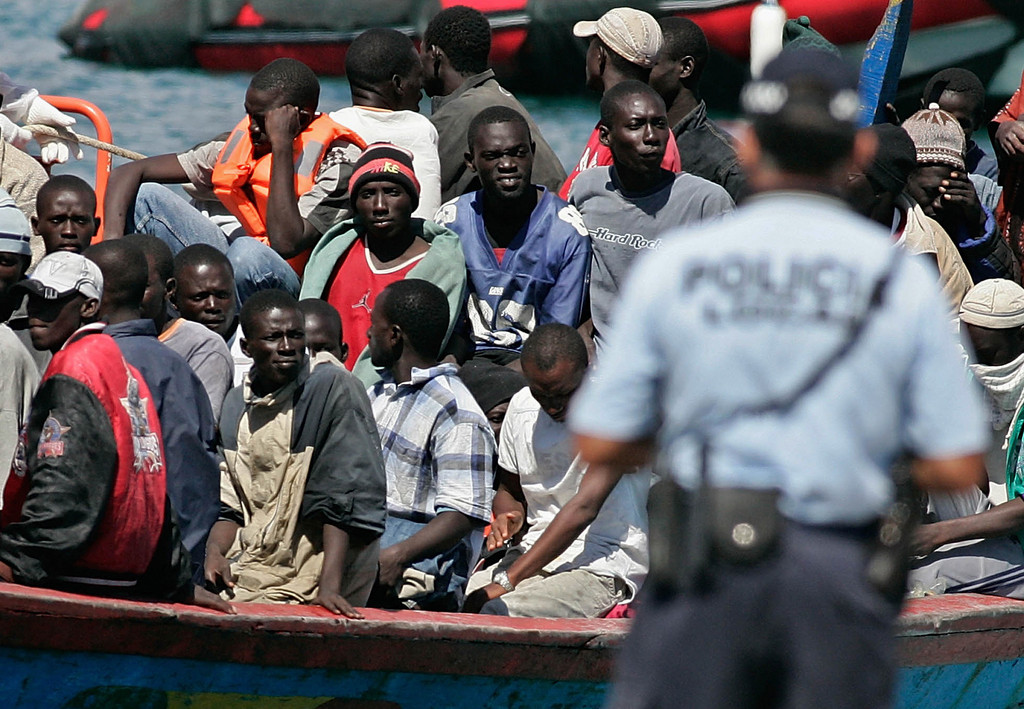 ▲一艘難民船於茅利塔尼亞外海翻覆,船上人員大多來自甘比亞。圖為西班牙加那利群島(Canary Island)警方與88名來自西非的移民。(圖/達志影像/美聯社)
