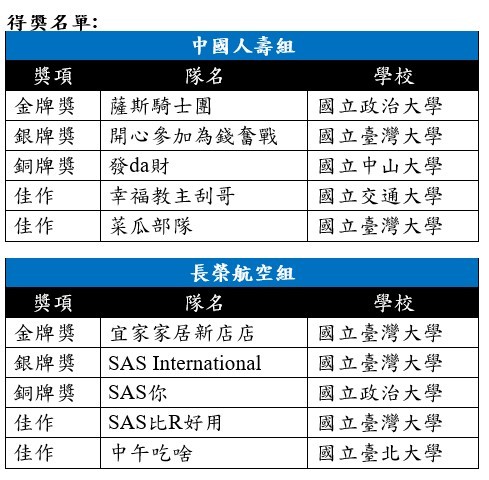 由全球數據分析與人工智慧解決方案領導廠商SAS、中國人壽及長榮航空三方首次聯手舉辦的「2019 AI新銳領航者競賽」,歷經2個多月、近600名學生的激烈挑戰,最終冠軍隊伍由政治大學企業管理研究所與金融學系研究所、台灣大學流行病學與預防醫學所的同學勝出,兩組各得12萬元冠軍獎金、共24萬元,全部得獎隊伍共獲62萬元總獎金。