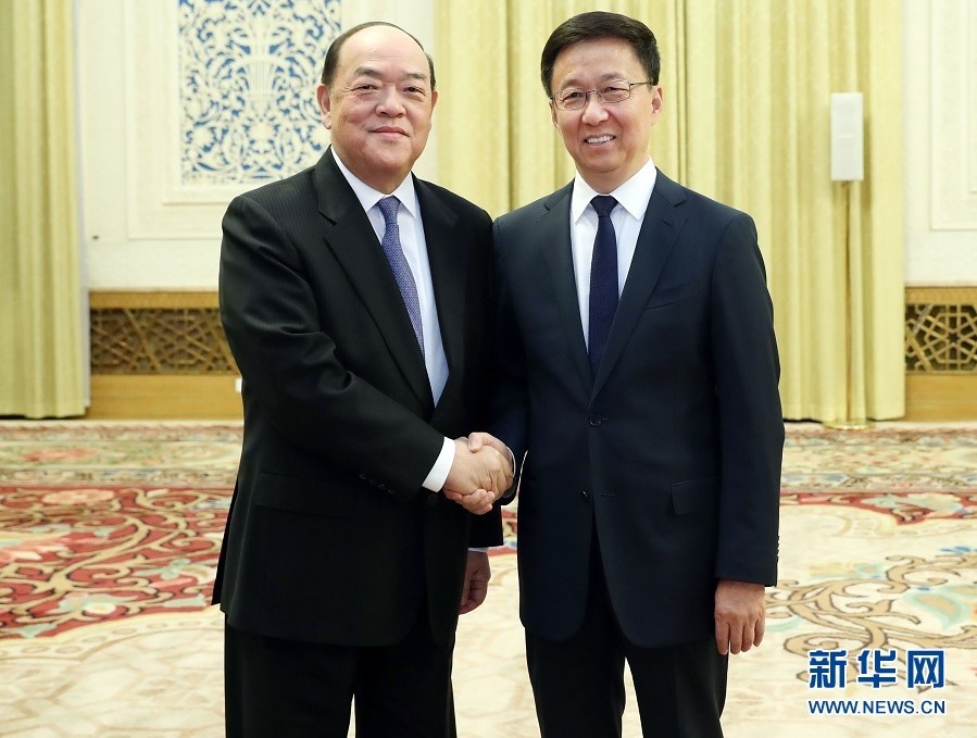 大陸國務院副總理韓正6日在人民大會堂會見了澳門候任行政長官賀一誠所率領,到北京接受任前培訓的新一屆政府管治團隊。韓正希望新一屆政府管治團隊在賀一誠行政長官的領導下,全面準確貫徹「一國兩制」方針。賀一誠等則表示,將推進具有澳門特色的「一國兩制」實踐取得新成績。
